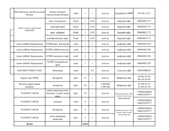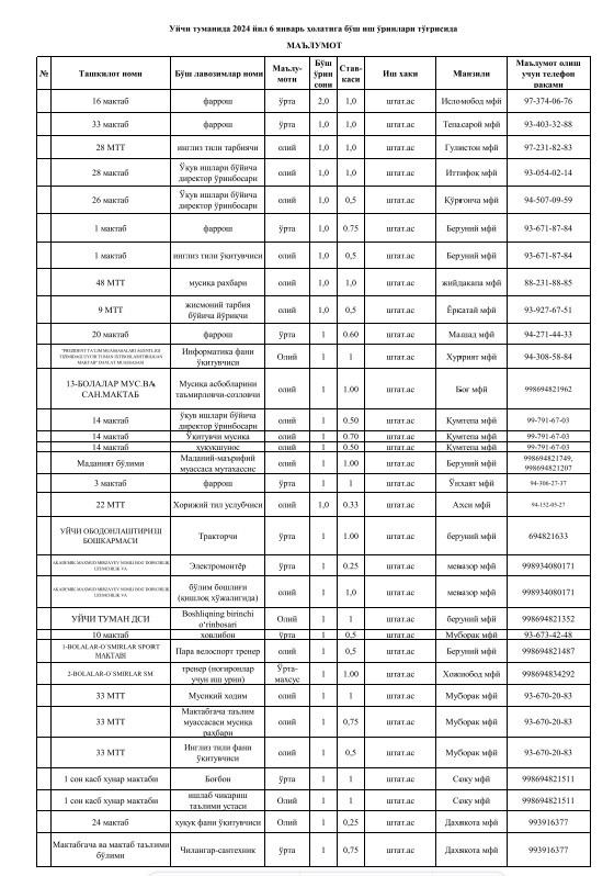 Уйчи туманида 2024 йил 6 январь ҳолатига бўш иш ўринлари тўғрисида МАЪЛУМОТ
