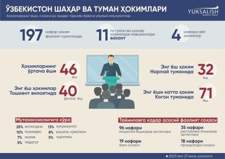 Дастлаб Ўзбекистон ҳокимлари ҳақида умумий тасаввур ҳосил қилиш имконини берувчи #инфографикани ҳавола этамиз. Унда айни пайтда ҳокимларнинг ёши, соҳаси ва гендер таркиби бўйича умумий маълумотлар акс этган.