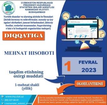 1-mehnat yillik statistika hisoboti davri estatda ochilgan, hisobot davri 1 - fevralgacha, 1- Sh va 1-MSh hisobotlari bekor qilinganligi va ushbu hisobotlar ayrim ko'rsatkichlari 1-mehnat yillik hisobotiga qo'shilganligi to'g'risida barcha hisobot topshiruvchi sub'ektlarini ogohlantiramiz!