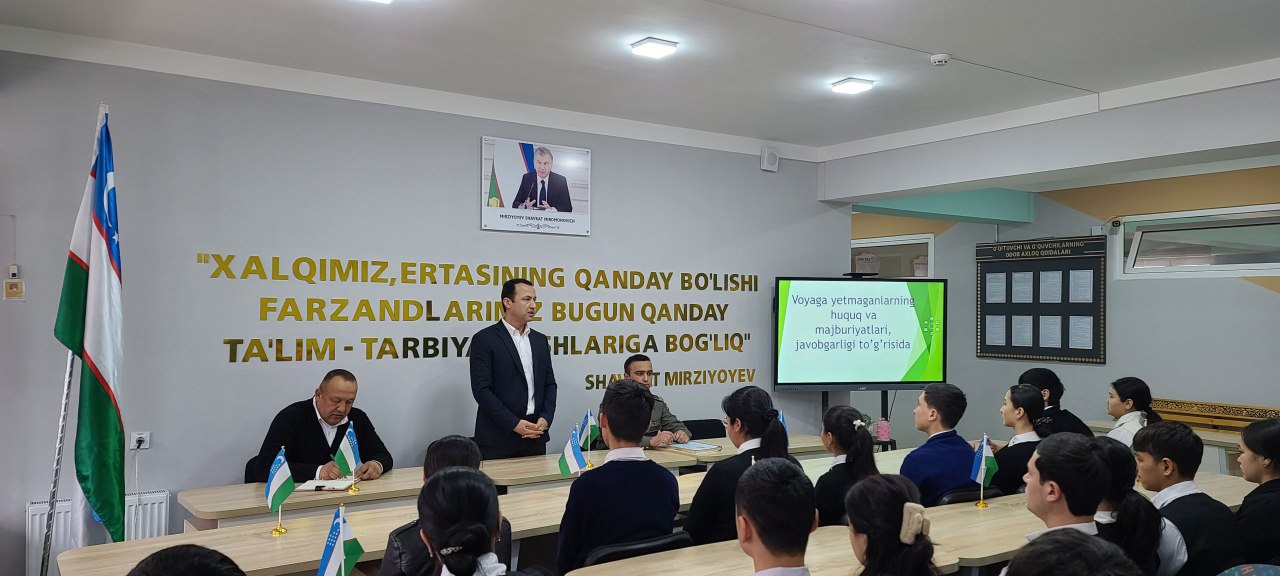 Инсон ҳуқуқлари соҳасида таълим бериш орқали ёшларнинг ҳуқуқ ва имкониятларини кенгайтириш юзасидан билим масканимиз юқори синф ўқувчилари билан “Вояга етмаганларнинг ҳуқуқ ва мажбуриятлари, жавобгарлиги” мавзусида учрашув ўтказилди.