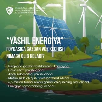 ✅ Ана шундай чоралардан бири қайта тикланадиган манбалардан олинадиган электр энергиясидан фойдаланишга — «яшил энергетика»га тўлиқ ўтишдир (https://t.me/ecogovuz/46286).