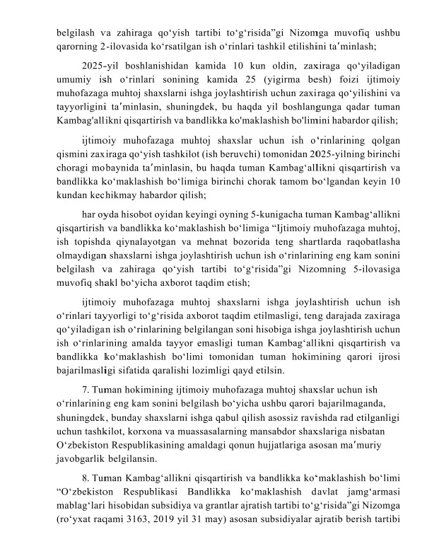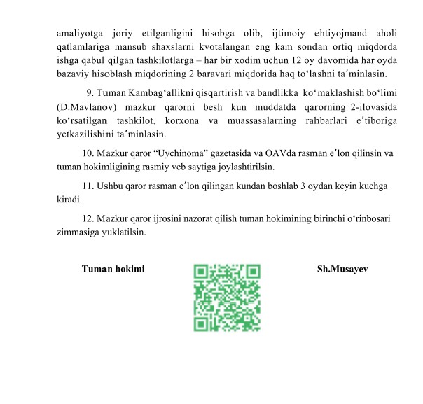 Бундан ташқари, жадид бобомиз Мулла Йўлдош Хилватий хонадонидаги уй музейи ташкил этилди. 4 нафар қатағон қурбонлари, 5 нафар маърифатли оила ҳонажонларининг пештоқларига ёрлиқлар илинди. Маънавий-маърифий ишларга доир 8 та турли номдаги китоб ва услубий қўлланмалар чоп эттирилди.2025 – “Атроф-муҳитни асраш ва “яшил” иқтисодиёт йили”да маҳалла маърифат тарғиботчилари иштирокида қуйидаги ишларни амалга ошриш кўзда тутганмиз. “Фазилатли ёшлар” лойиҳаси орқали ўрта махсус, касб-ҳунар ва олий таълим муассасалари битирувчиларини ишга жойлаштириш ҳамда хусусий тадбиркорлик соҳасига жалб этиш; Ёш авлоднинг ижодий ва интеллектуал салоҳиятини қўллаб-қувватлаш ва рўёбга чиқариш, болалар ва ёшлар ўртасида соғлом турмуш тарзини шакллантириш, уларни жисмоний тарбия ва спортга кенг жалб этиш; Маҳаллада ёш тадбиркорлар учун профессионал консалтинг хизматларини йўлга қўйишни таъминлашга қаратилган “Менинг бизнес лойиҳам” номли услубий қўлланма ишлаб чиқиш ва бепул тарқатиш.“Маънавият маршрути” лойиҳаси доирасида тумандаги 24 та номоддий ва маданий мерос объектларини кенг тағиб этиш.• “ЯШИЛ ТАРАҚҚИЁТ УЧУН” лойиҳаси орқали “Маънавият сектори” раҳбари бошчилигида маърифат зиёлилари, ташкилот ва муассасаларнинг маънавий-маърифий ишлар бўйича масъуллари, маҳалла маърифат тарғиботчилари, хотин-қизлар фаоллари ва меҳнат фаҳрийлари ҳамкорлигида “МАЪРИФАТ БОҒИ”ни ташкил этиш;• «яшил» иқтисодиётни ўсиши орқали аҳолининг иқтисодий фаоллиги ошишини;• маҳаллада томорқадан унумли фойдаланишни;• маҳалланинг ободлиги, кўчанинг кўкаламзорлаштирилишини тарғиб қилишни истиқболли режамизга киритганмиз.