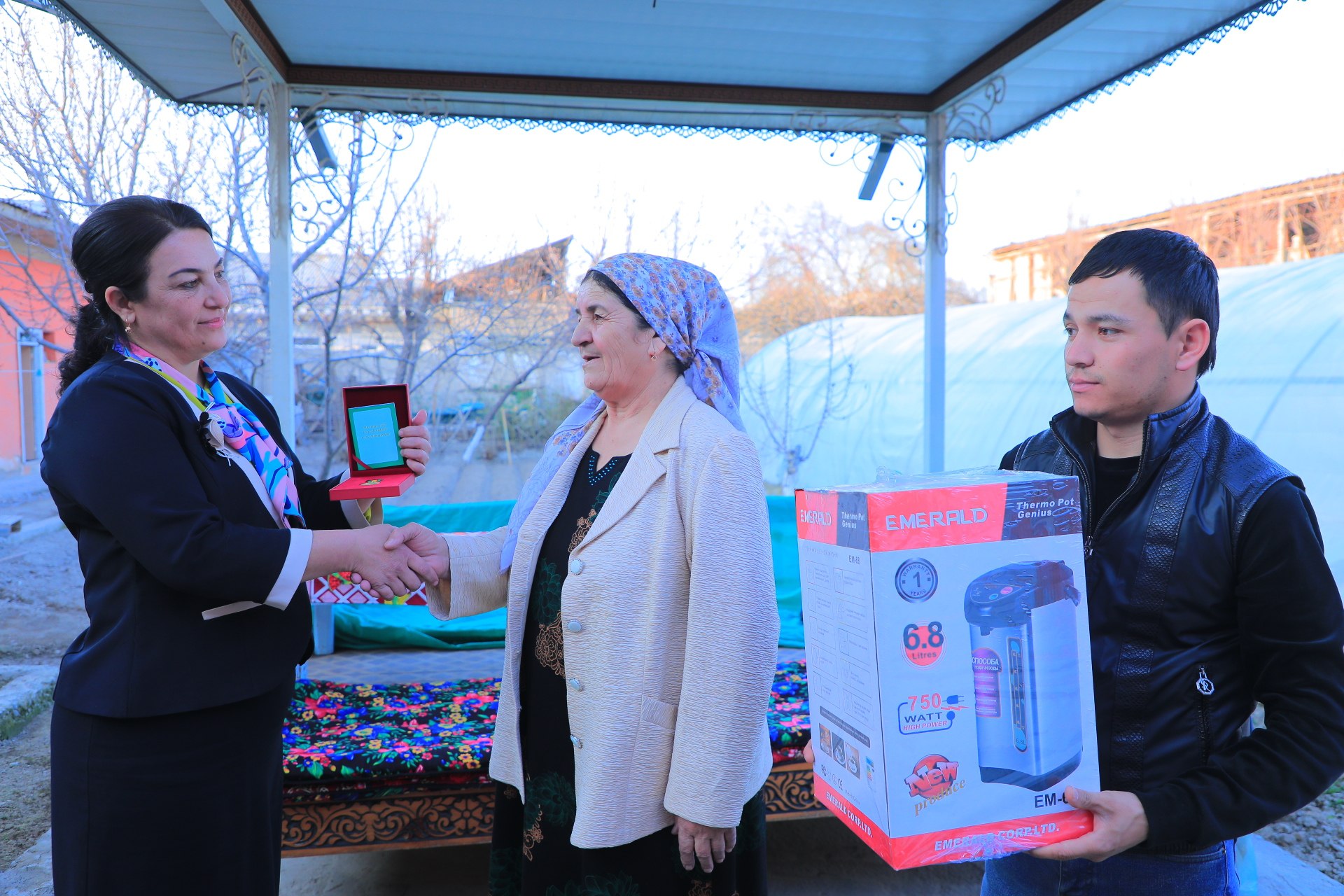 Бугун туман ҳокимининг ўринбосари Саидахон Аҳмадалиева меҳнат фахрийси Раҳбархон Қўзибоева хонадонида бўлиб, “Мўътабар аёл” кўкрак нишони ҳамда эсдалик совғасини топширди.
