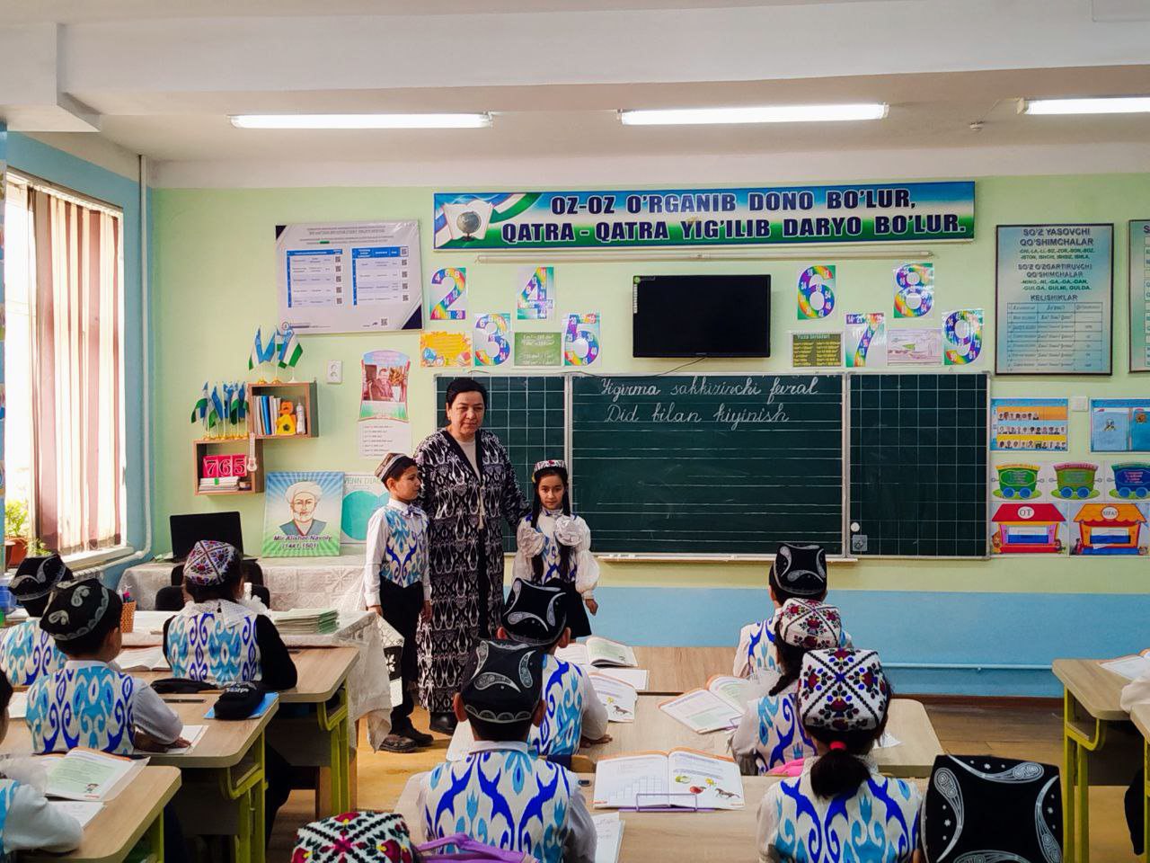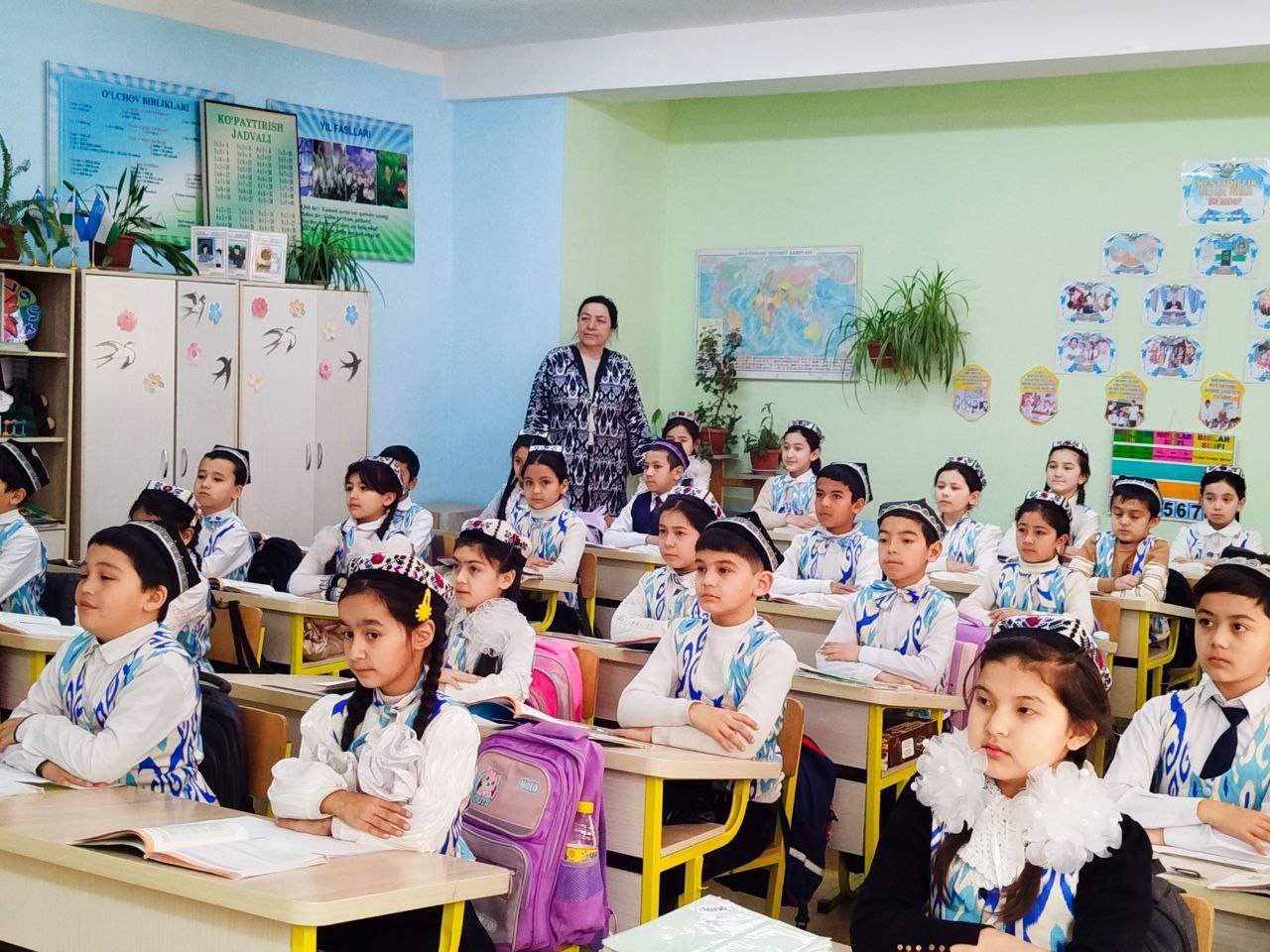 Uychi tumanidagi ayrim fanlar chuqur oʻqitiladigan sinflari mavjud boʻlgan 1-sonli umumiy oʻrta ta'lim maktabining boshlangʻich ta'limining oliy toifali oʻqituvchisi Saidaxon Mirzayeva rahbarligida 3-"D" sinf oʻquvchilari, bugungi ma'naviyat soatu darsini milliy liboslarda, bahoriy kayfiyat bilan tashkil etishdi.