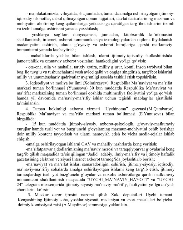 “Мезбон” тантаналар мажмуасида бўлиб ўтган тадбирда вилоят Кенгаши депутати, туман ҳокимининг маслаҳатчиси Т.Исматиллаев, туман ҳокимининг ўринбосари А.Собиров, туман ИИБ бошлиғи, 3-сектор раҳбари У.Эшанов, Ўзбекистон маҳаллалари уюшмаси туман бўлими бошлиғи Ҳ. Аҳмедовлар самимий тилаклар билдиришди. Энг ибратли фаолият олиб борган маҳалла фуқаролар йиғинлари раислари эътироф қилинди.