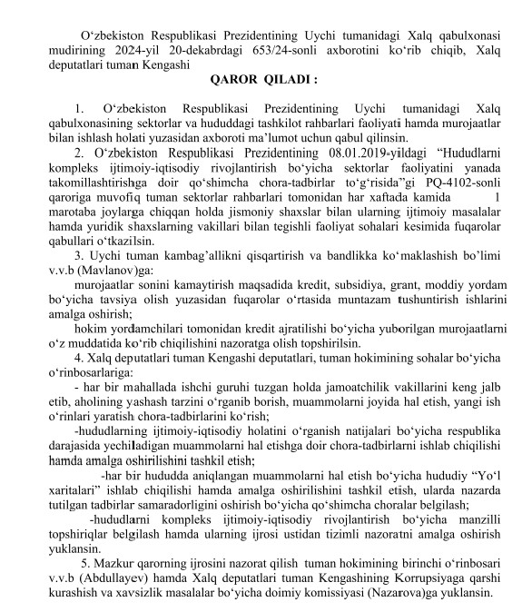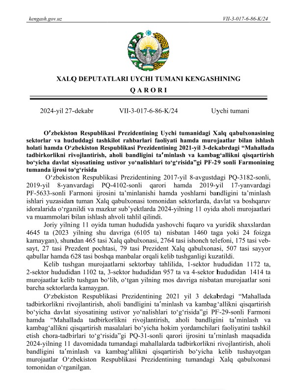 “Тадбиркорлар учун тенг шароитлар ва адолатли рақобат муҳитини таъминлаш бўйича навбатдаги чора-тадбирлар тўғрисида”ги Президент Фармони (ПФ-229-сон, 27.12.2024 й.) қабул қилинди
