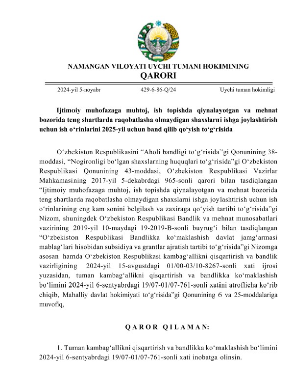 Декабрь – «Ҳуқуқий маданиятни ошириш” ойлиги доирасида Уйчи туманидаги 34-сонли давлат мактабгача таълим ташкилотининг катта тайёрлов гуруҳи тарбияланувчилари билан «Мадҳиям фахрим» мавзусида суҳбат ташкил этилди.