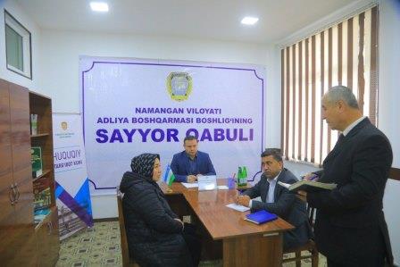 Ҳуқуқни муҳофаза қилувчи идоралар раҳбарларининг Уйчи тумани "Деҳқон" маҳалласидаги "Маданият саройи"да ўтказган сайёр қабулида Наманган вилояти адлия бошқармаси бошлиғи Д.Аҳмедов томонидан фуқароларнинг туғилганлик гувоҳномасини такроран олиш, кадастр, мерос, алимент каби масалалар юзасидан 14 та мурожаати тингланди.